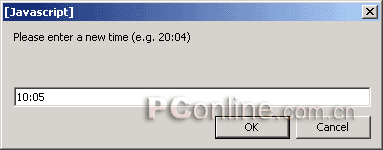 对话框给我们的提示已经很清楚了,直接在文本框内输入新的时间,然后单击ok按钮,看看钟表的时针、分针是不是按照你输入的时间来显示排列的啊?这个功能很有意思,mm公司现在在对产品的开放性的研发上可以说是煞费苦心啊!、通过图形来和js挂钩,真是很棒的思路!佩服佩服!