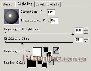 7、选中打孔后生成的椭圆环对象,执行properties属性面板的effects ---> eye candy 4000 le ---> bevel boss 效果命令,在弹出的设置框中进行设定:basic选项不用进行修改了,bevel profile选项也保持默认,lighting选项需要进行一些简单的调整,具体的数值大小根据椭圆环的大小来设定,本步的目的就是要产生园环的高光点效果,可以通过观察预览窗口的效果来进行调整,本例设定数值如下图所示: