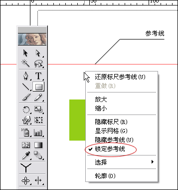 【ctrl +r】打开标尺,从水平标尺区拖拽出一条参考线。在画板上点击右键,如果看到锁定参考线选项被选中,把它关闭。我们就激活了参考线。