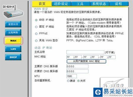 5、 进入「WAN」界面后,点选「动态IP 地址」,其它字段请勿输入或任意更改,最后点选「执行」按钮。