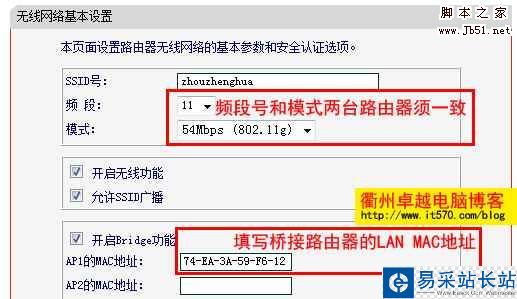 | 路由器管理界面——无线参数——基本设置 勾选“开启Bridge功能” 在AP1的MAC地址中输入之前记录的对方LAN口MAC地址(两台路由器同样操作)。在频段和模式选项中两台路由器须一致否则无法连接。 |