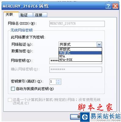 (2)无线网络配置界面添加配置文件,“关联”选项卡中“网络身份验证”选择“共享式”即可解决,如下图所示: