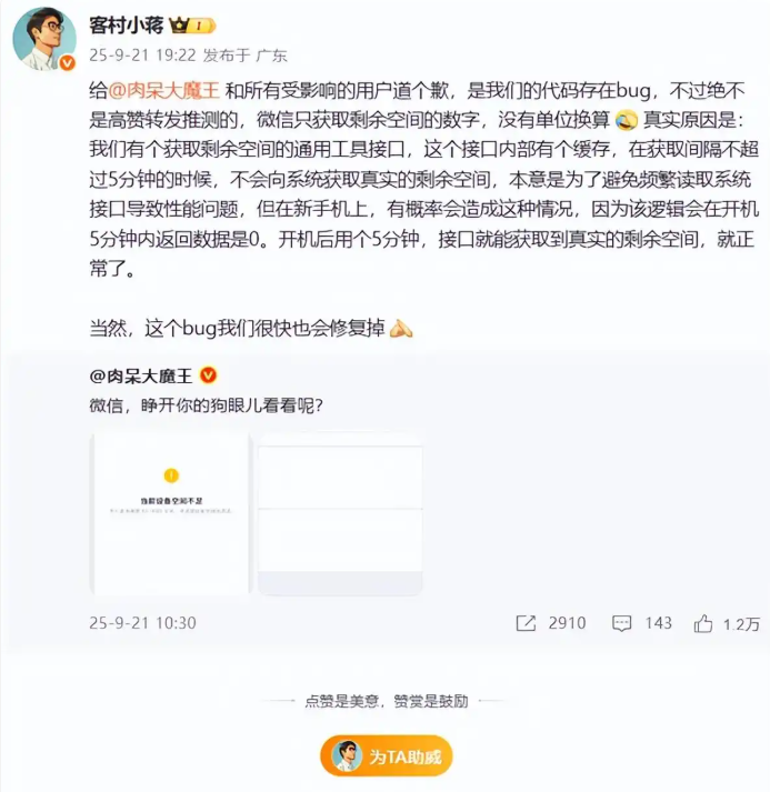 微信员工回应新iPhone提示空间不足