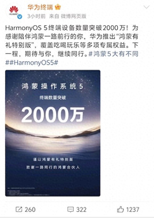 鸿蒙5终端数突破2000万 应用和元服务超3万款
