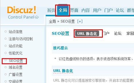 在我们架设好Discuz! X3后,打开后台进入到 全局 - seo设置 - URL静态化,如下图所示: