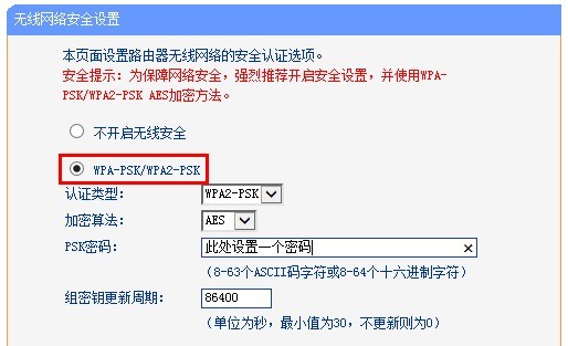 进去后,找到 无线设置 - 无线安全设置,选中 WPA-PSK/WPA2-PSK 这个选项,然后按下图设置: